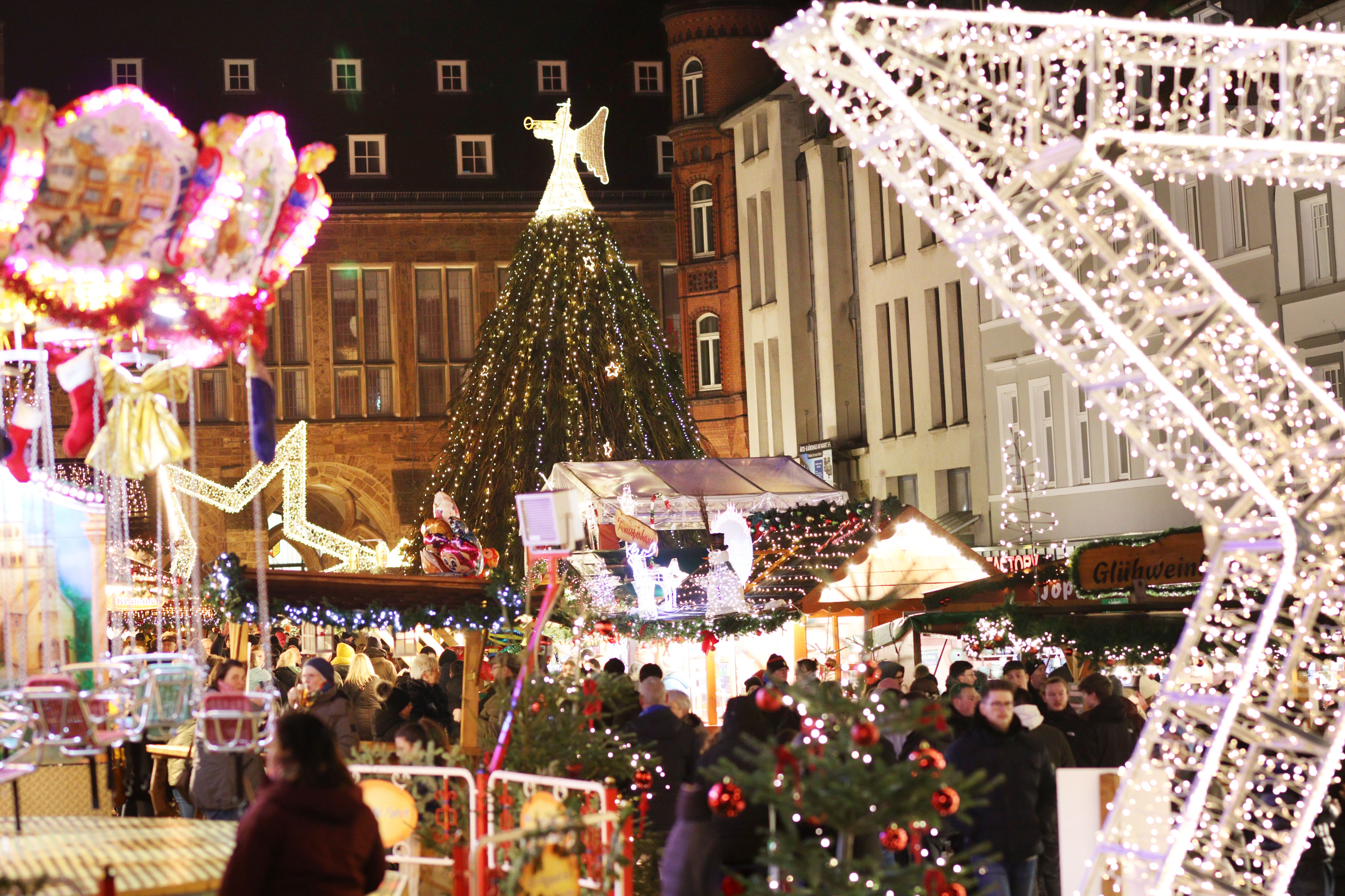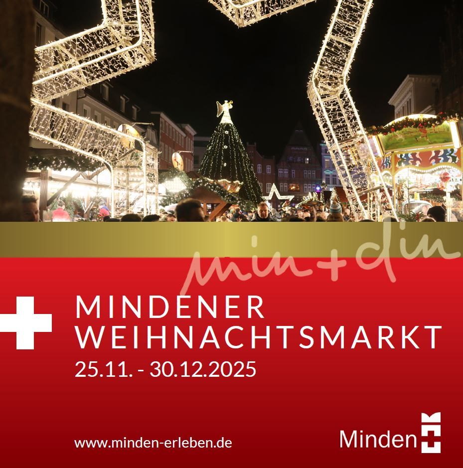 Vom 25. November bis zum 30. Dezember 2025 erstrahlt in der Mindener Innenstadt der Weihnachtsmarkt in festlichem Lichterglanz. Umrahmt von Weihnachtstannen, Lichterketten und Sternen locken liebevoll gestaltete Marktstände auf den historischen Marktplatz und an den Scharn. Nicht nur dort warten Leckereien, Kinderattraktionen und kreative Geschenkideen auf die Gäste, sondern auch am Obermarkt gibt es heiße Getränke, Lagerfeuer mit Weihnachtsflair und gemütliches Ambiente.